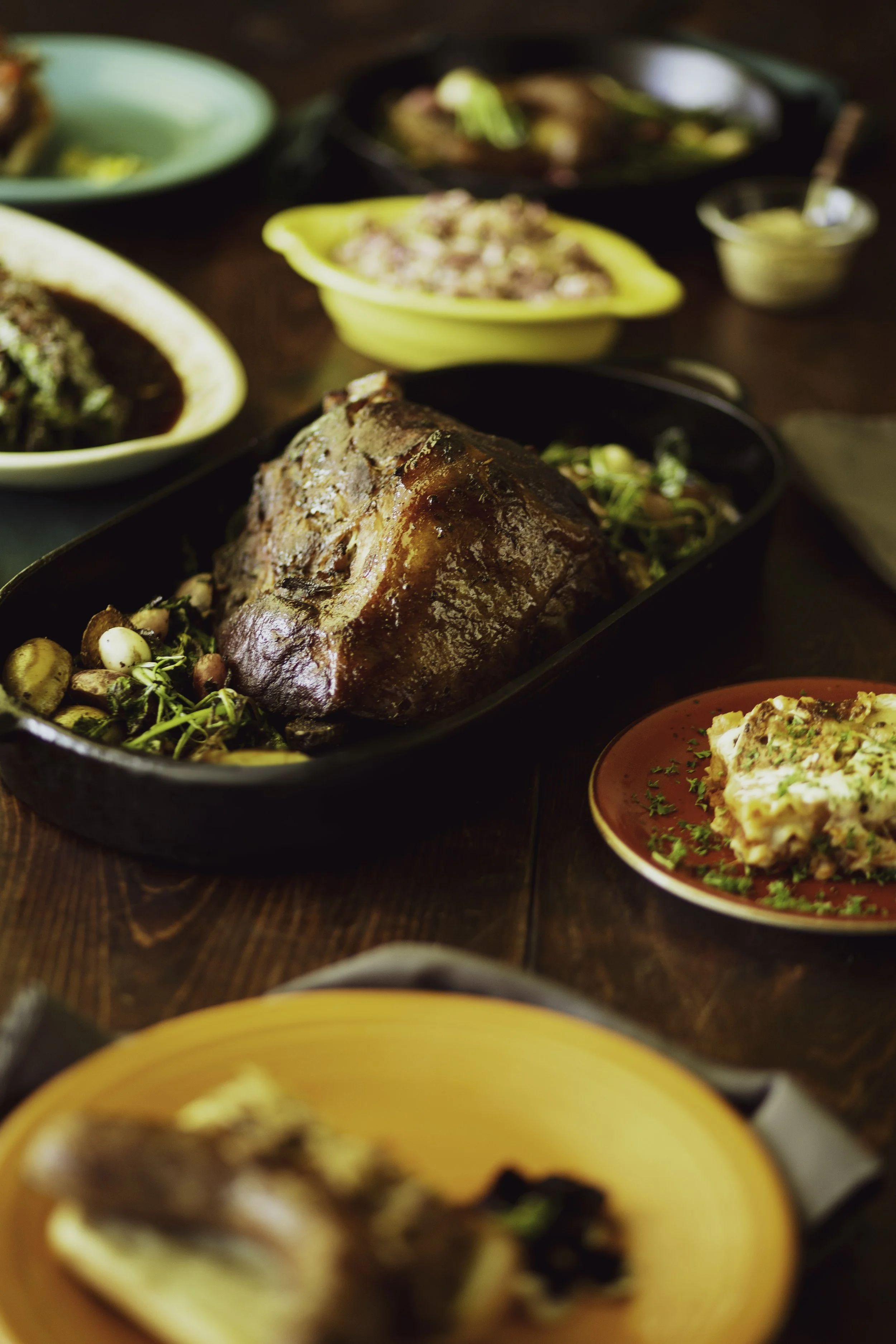Choice of two meats, bread, two sides, dessert, one vegan/vegetarian selection